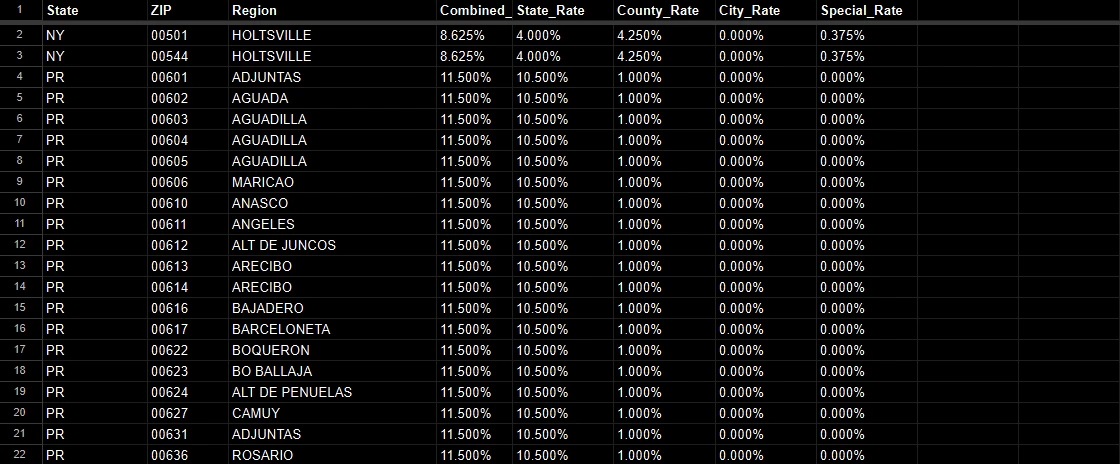 This output with 8 headers is available in our API and in the Developer Sales Tax CSV file. It includes the full breakdown of rates per ZIP including state, county, city, special & combined rates to 3 decimal points. State, Region & ZIPs are included: